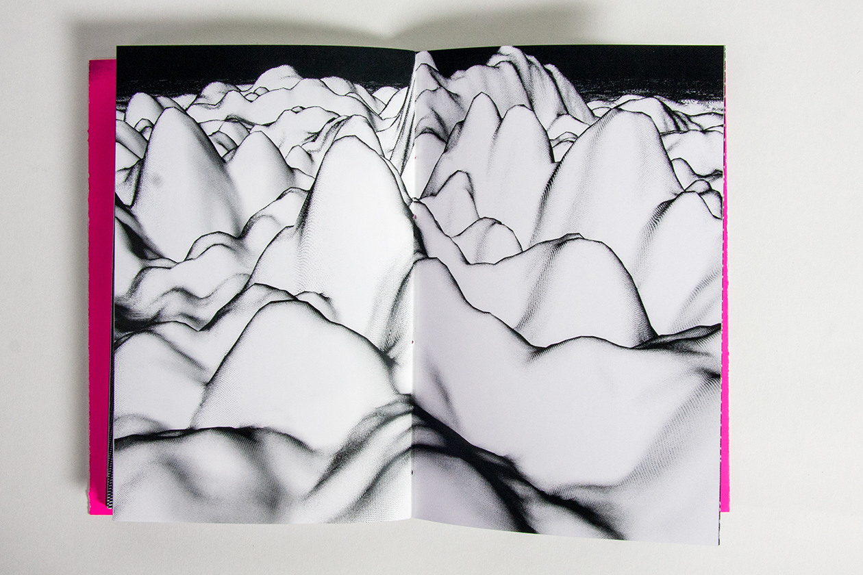 L’exercice de créer un livre de 200 pages en deux semaines force à trouver un système qui permet de générer beaucoup de contenu, très rapidement. Un logiciel de rendu 3D a permis de créer 100 doubles pages uniques, à partir de deux règles pour la création des images, soit ne pas travailler plus de 10 minutes sur un visuel et n’utiliser que le noir et le blanc. Le résultat est un recueil d’explorations abstraites ayant comme seul objectif d’être regardées.
